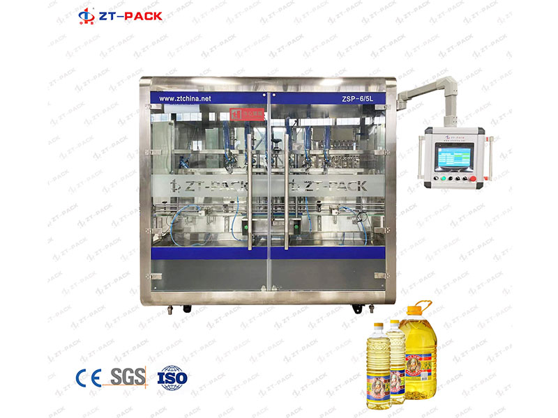 Esta llenadora de aceite comestible es una máquina de llenado de tipo pistón con alta precisión de llenado.