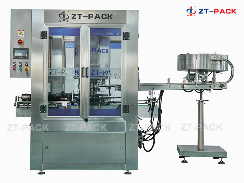 La tapadora rotativa está equipada con 6/8 manipuladores para la alimentación automática de botellas, colocación de tapas, sujeción de tapas, y tapado. Se utiliza la correa para completar el proceso de tapado para garantizar que las botellas no se dañen. Durante el proceso de tapado se utiliza una pinza neumática para apretar la tapa; además la máquina está equipada con un embrague de alto rendimiento. Después del deslizamiento, el proceso de tapado continuará automáticamente sin dañar las tapas. Este equipo se caracteriza por su alta velocidad de tapado y la alta tasa de aprobación que hacen que sea muy poco probable que productos no calificados salgan de la línea de producción. Una vez finalizado el proceso de tapado, el dispositivo se retirará automáticamente para evitar que se dañe la tapa. La tasa de aprobación y la velocidad de cierre son bastante altas.