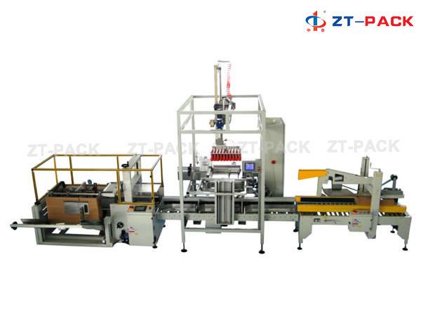 La línea de envasado en cajas de cartón se encarga de abrir, empacar y sellar las cajas llenas botellas de vidrio o plástico, redondas o planas. Esta máquina empacador de cajas de cartón se utiliza para envasar alimentos, bebidas, productos farmacéuticos, cosméticos, fertilizantes y productos químicos.